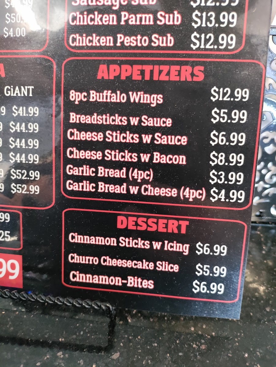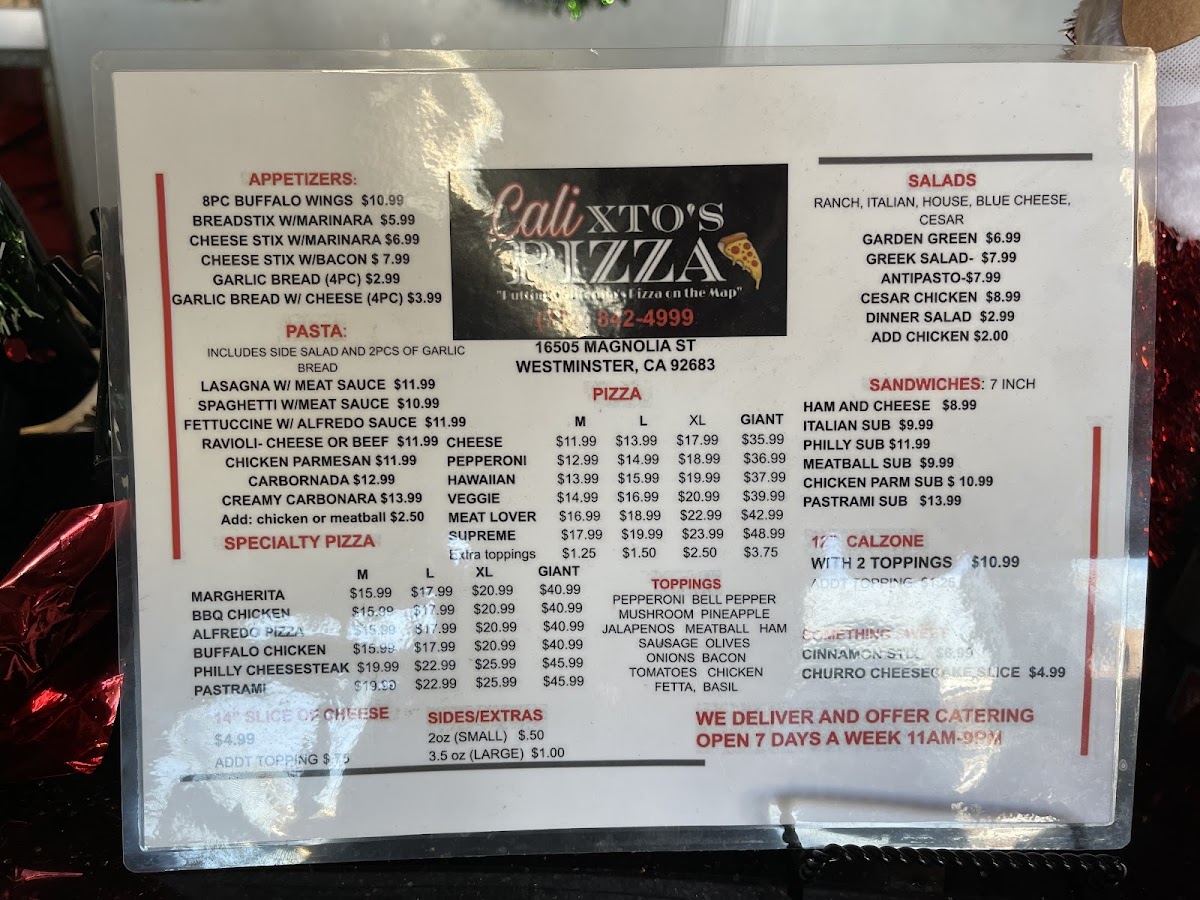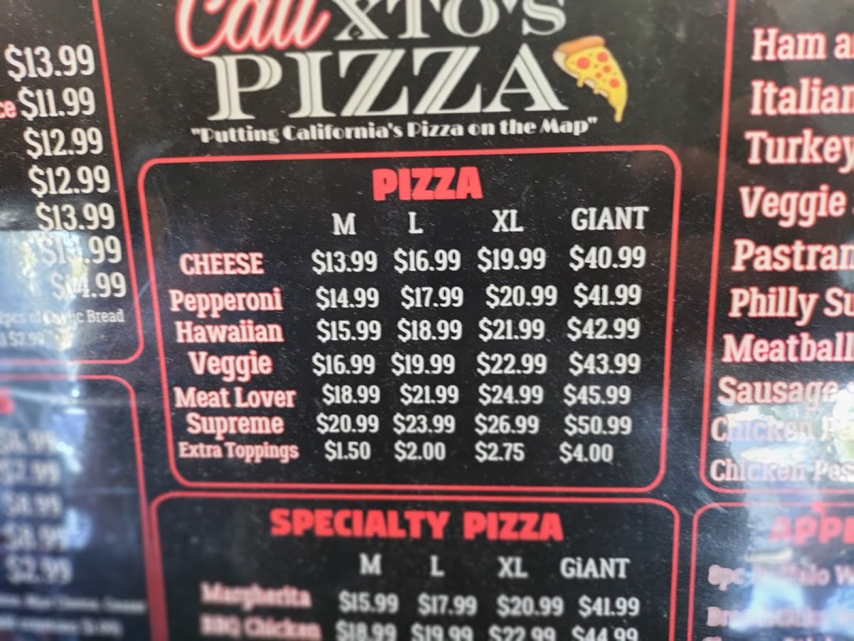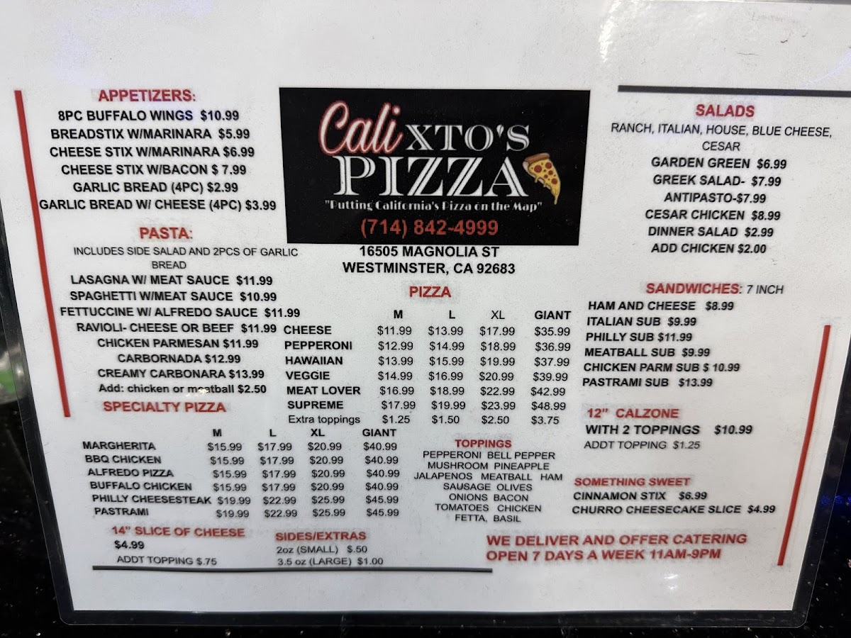 From a reviewer’s perspective, the menu at Calixtos Pizza offers a wide variety of satisfying options, especially for those who enjoy hearty portions and classic comfort foods. The specialty pizzas like Philly Cheesesteak (18" X-Large), Margherita (14" Large), Alfredo Pizza (18" X-Large), Alfredo Pizza (28" Giant), and Pastrami (14" Large) stand out as flavorful choices, while traditional options such as Meat Lover (12" Medium), Veggie (28" Giant), Pepperoni (12" Medium), and Hawaiian (14" Large) provide familiar favorites. Beyond pizza, the menu is well-rounded with salads like Antipasto and Greek Salad, pastas including Chicken Parmesan and Lasagna With Meat Sauce, and satisfying sandwiches such as the Philly Sub and Chicken Pesto Sub. Appetizers like Cheese Stix With Sauce and desserts such as Churro Cheesecake Slice and Cinna-Bites complete the experience, making the menu diverse enough to appeal to both pizza lovers and those looking for a full Italian-American meal.